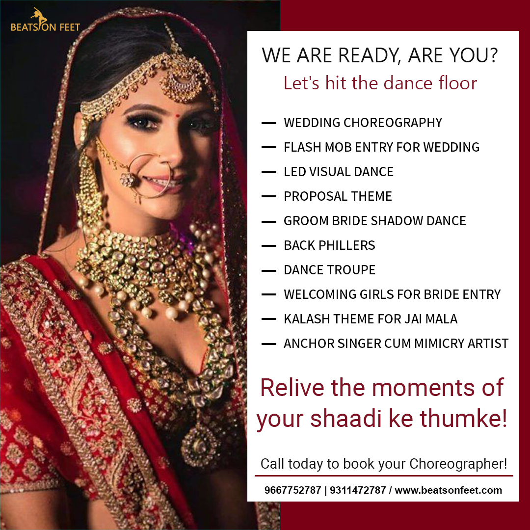 Beats On Feet has been within the business for a few time now so expect fire-blazing choreographies! So, dust off your dancing shoes and obtain able to make the Sangeet an eventful and memorable ceremony. Contact us today because we are offering chipset prices now. We have charged 1000 per song. Our starting choreography package is 10,000 only but you can find heaviest package if you can afford.
